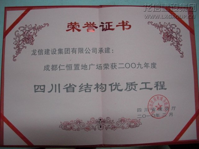 成都仁恒獲四川省優(yōu)質(zhì)結(jié)構(gòu)