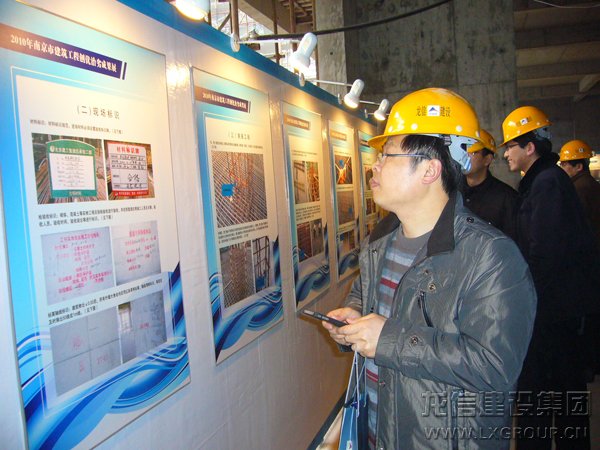 由江蘇省建設(shè)廳、南京市住建委和南京市質(zhì)監(jiān)站組織,2011年2月22日建設(shè)部吳慧娟司長及隨行、省建設(shè)廳徐副廳長、省各市縣建工局、安監(jiān)站、質(zhì)監(jiān)站領(lǐng)導(dǎo)300余人在南京市精品示范工程試點(diǎn)項(xiàng)目----龍信集團(tuán)仁恒G53公寓項(xiàng)目部進(jìn)行現(xiàn)場觀摩活動。集團(tuán)公司董事長陳祖新、南京分公司經(jīng)理江建明、項(xiàng)目部陳揚(yáng)、朱福生、蔡春燕、葛玉林、徐向華、李雪平、張沖、朱永新等同志陪同、解說。